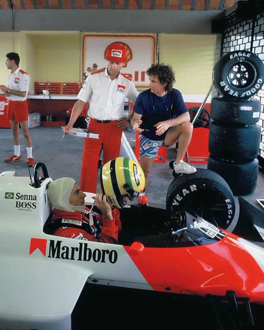 The development program began soon after Monza. The first MP4‑3B running came at Silverstone in late 1987, with Alain Prost conducting the initial shakedown in cold conditions. Honda then required a dedicated test platform in Japan, and Emanuele Pirro was brought in as test driver. Over the winter of 1987–88 he completed “thousands of kilometres” at Suzuka, working through fuel‑economy maps and drivability for the new 2.5‑bar, 150‑litre regime. By early 1988 the MP4‑3B travelled to Jacarepaguá in Rio, where Senna and Prost used the Honda‑powered mule in pre‑season running while the final MP4/4 was still in build; period photography confirms the MP4‑3B configuration at that test.